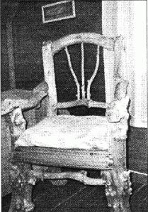 "Tämä tuoli on luultavasti itsensä Akseli Gallen-Kallelan suunnittelema. Tuolille on pari ja kalustoon kuuluu myös pöytä. Kalusto on Äyräpään peruja. - Näin Dagmar kertoo hänelle kerrotun, Olli Laibert täsmentää Gallen-Kallelan nimen liitetyn kalustoon perimätiedossa, muuta todistusaineistoa ei asian tiimoilta ole."